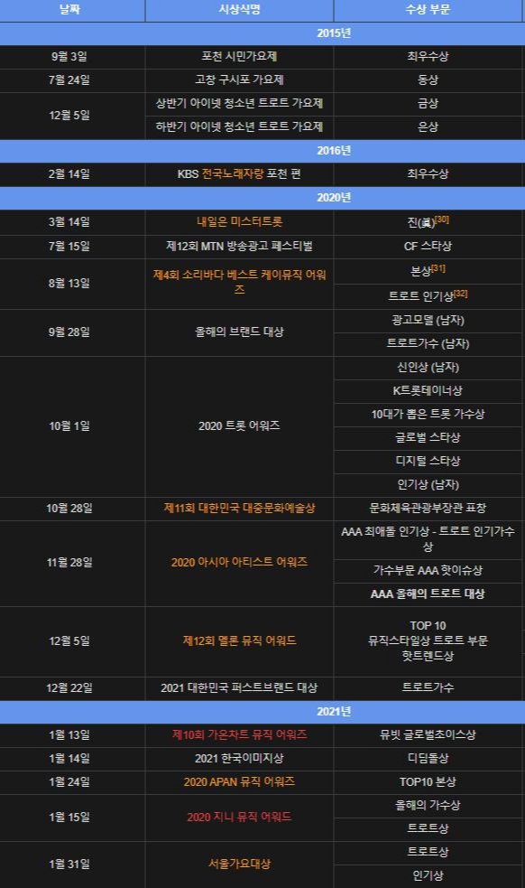 가요계와 광고계의 블루칩으로 전성기를 맞아하였습니다. 그뒤로 트로트라는 장르 말고 다양한 장르를 발표하고 있습니다.